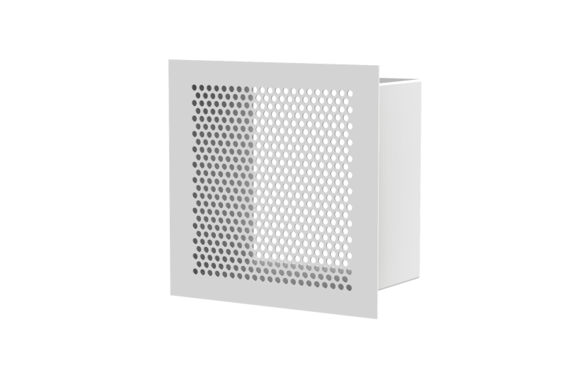 OMH-accepted for medium-risk areas, the perforated 14-gauge steel risk-resistant security grille (SEG-9SP3) features 3/16-inch diameter holes on 9/32-inch staggered centers, tamper-resistant countersunk screw holes with matching screws and a white polyurethane finish. It is available with versatile mounting options, with accessories such as balancing dampers and is available in heavier steel gauges.